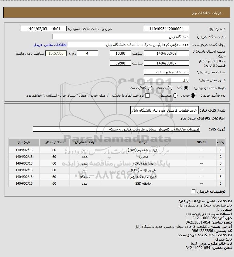 شرح کلی نیاز: خرید قطعات کامپیوتر مورد نیاز دانشگاه زابل