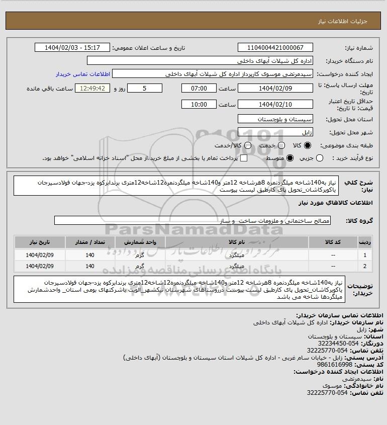 توضیحات خریدار:نیاز به140شاخه میلگردنمره 8هرشاخه 12متر و140شاخه میلگردنمره12شاخه12متری برندابرکوه یزد-جهان فولادسیرجان یاکویرکاشان_تحویل پای کارطبق لیست پیوست درروستاهای شهرستان نیکشهر_الویت باشرکتهای بومی استان_ واحدشمارش میلگردها شاخه می باشد