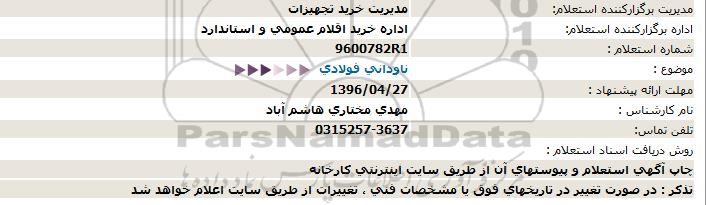 استعلام بها و موضوع استعلام استعلام , استعلام ناودانی فولادی به اطلاع کلیه شرکت‌ها و افراد متخصص واجد شرایط می‌رساند، آگهی گذار در نظر دارد از طریق استعلام بها، نسبت به انتخاب و دریافت پیشنهادات اقدام نماید. این استعلام با کد آگهی ثبت شده در سامانه خبرگزاری پارس نماد : 892078 منتشر شده است. مشخصات استعلام : تاریخ شروع استعلام: 1396/04/25 آخرین مهلت ارسال پیشنهاد قیمت : 1396/04/27 و محل اجرای پروژه : استان اصفهان میباشد. استعلام قیمت مورد درخواست : استعلام , استعلام ناودانی فولادی با دسته‌بندی‌های تخصصی و گروه های مرتبط : آهن آلات, استعلام اطلاع رسانی میگردد.