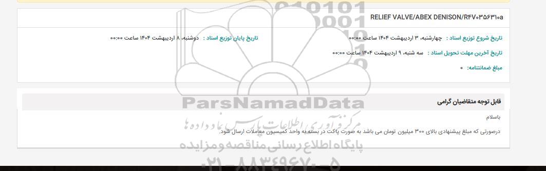 استعلام RELIEF VALVE/ABEX DENISON/R4V0356310a , استعلام RELIEF VALVE/ABEX DENISON/R4V0356310a