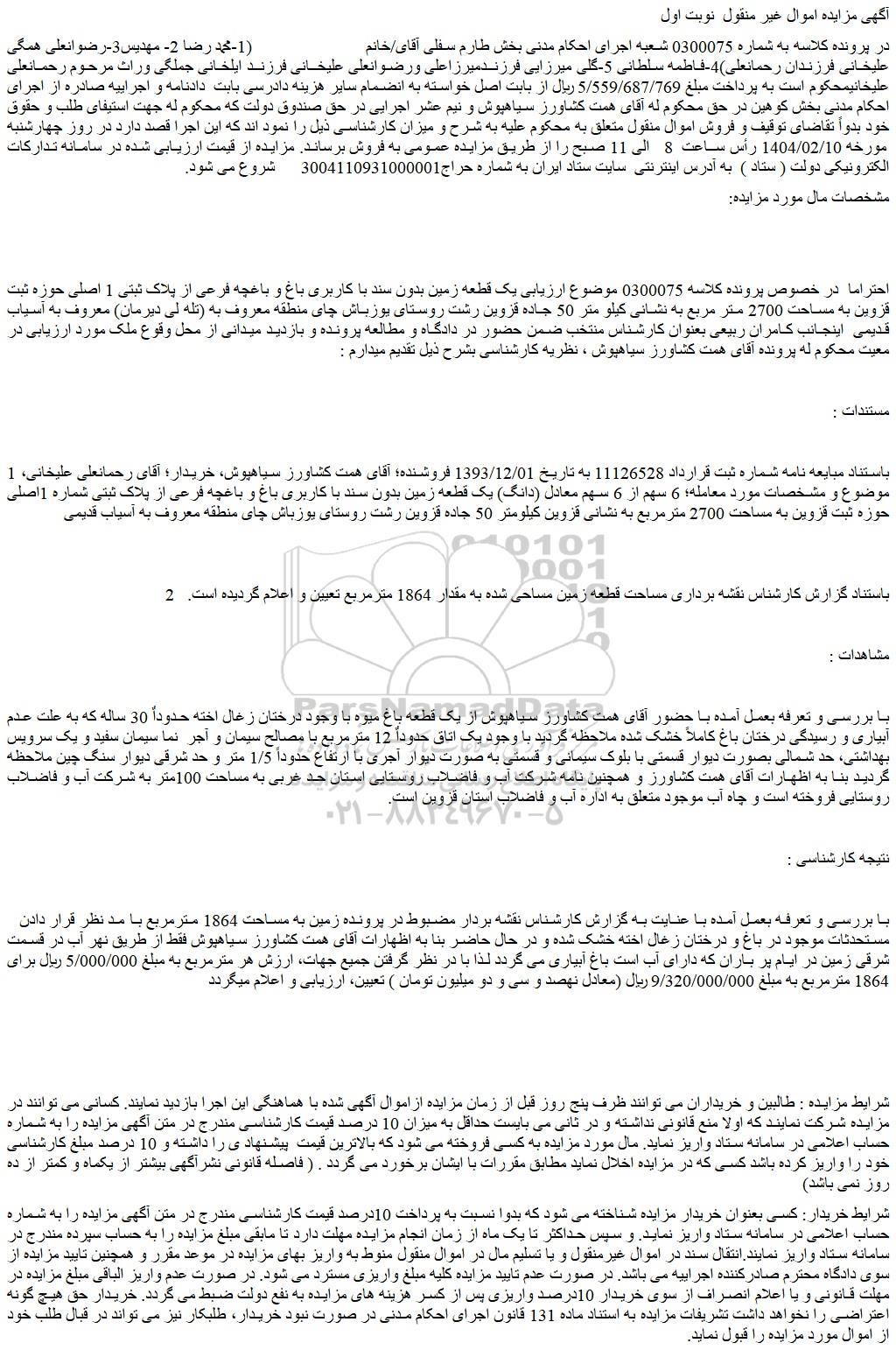 احتراما در خصوص پرونده کلاسه 0300075 موضوع ارزیابی یک قطعه زمین بدون سند با کاربری باغ و باغچه فرعی از پلاک ثبتی 1 اصلی حوزه ثبت قزوین به مساحت 2700 متر مربع به نشانی کیلو متر 50 جاده قزوین رشت روستای یوزباش چای منطقه معروف به (تله لی دیرمان) معروف به آسیاب قدیمی اینجانب کامران ربیعی بعنوان کارشناس منتخب ضمن حضور در دادگاه و مطالعه پرونده و بازدید میدانی از محل وقوع ملک مورد ارزیابی در معیت محکوم له پرونده آقای همت کشاورز سیاهپوش ، نظریه کارشناسی بشرح ذیل تقدیم میدارم :