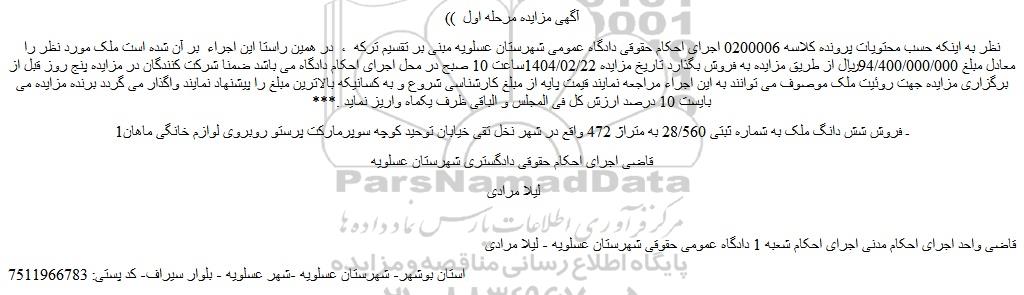 نظر به اینکه حسب محتویات پرونده کلاسه 0200006 اجرای احکام حقوقی دادگاه عمومی شهرستان عسلویه مبنی بر تقسیم ترکه ، در همین راستا این اجراء بر آن شده است ملک مورد نظر را معادل مبلغ 94/400/000/000ریال از طریق مزایده به فروش بگذارد تاریخ مزایده 1404/02/22ساعت 10 صبح در محل اجرای احکام دادگاه می باشد ضمنا شرکت کنندگان در مزایده پنج روز قبل از برگزاری مزایده جهت روئیت ملک موصوف می توانند به این اجراء مراجعه نمایند قیمت پایه از مبلغ کارشناسی شروع و به کسانیکه بالاترین مبلغ را پیشنهاد نمایند واگذار می گردد برنده مزایده می بایست 10 درصد ارزش کل فی المجلس و الباقی ظرف یکماه واریز نماید .***