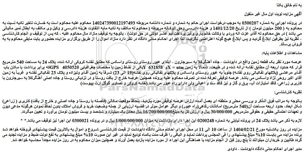 در پرونده اجرایی به شماره 0300207 به موجب درخواست اجرای حکم به شماره و شماره دادنامه مربوطه 140247390012197493 محکوم علیه محکوم است به خسارت تاخیر تادیه نسبت به محکوم به ( 200 میلیون تومان ) از تاریخ 1401/12/20 و هزینه دادرسی وحق الوکاله مربوطه ( محکوم له مکلف به تادیه مابه التفاوت هزینه دادرسی و وکیل وی مکلف به ابطال تمبر مالیاتی می باشد ) در حق محکوم له آقای عزت اله وردی با وکالت خانم یاری و نیز پرداخت نیم عشر دولتی در حق دولت) ، باتوجه به توقیف مازاد مال محکوم علیه ، که پس از توقیف و انجام کارشناسی ، نظریه نیز بطرفین ابلاغ گردید و پس ابلاغ هیچ گونه اعتراضی نگردید، لذا اجرای احکام مدنی دادگاه در نظر دارد مازاد اموال را از طریق برگزاری مزایده حضوری بابت مابقی محکوم به به فروش برساند.
