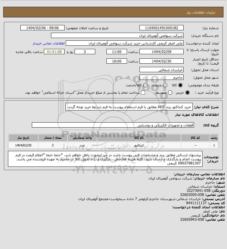 شرح کلی نیاز: خرید کنتاکتور برند AEG مطابق با فرم استعلام پیوست