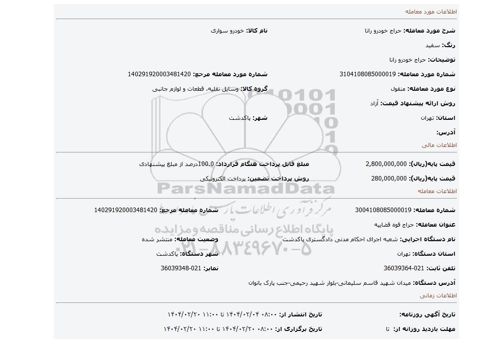 شرح مورد معامله: حراج خودرو رانانام کالا: خودرو سواری