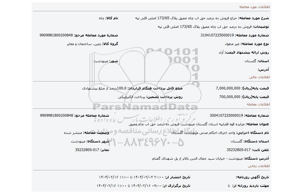 عنوان معامله: مزایده قوه قضاییه استان گلستان مینودشت فروش ده درصد حق اب چاه عمیق
