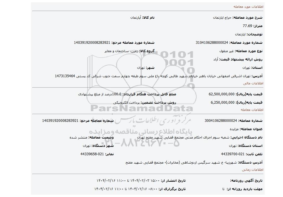 مزایده عمومی مزایده اپارتمان برگزار میگردد. از کلیه افراد متخصص و شرکت‌های واجد شرایط دعوت به عمل می‌آید تا در این مزایده با کد خبرگزاری پارس نماد : 8925273 شرکت نمایند تاریخ شروع مزایده : 1404/02/03 مهلت شرکت در مزایده: تا پایان روز 1404/02/16 مکان برگزاری اموال واگذاری استان‌های تهران و دسته‌بندی‌های مربوط به این حراجی املاک و زمین میباشد.
