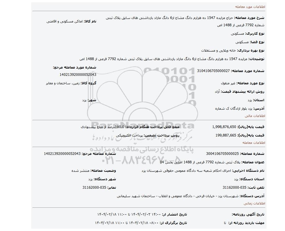| شرح مورد معامله: حراج مزایده 1547 ده هزارم دانگ مشاع از6 دانگ مازاد بازداشتی های سابق پلاک ثبتی شماره 7792 فرعی از 1488 اص | نام کالا: اماکن مسکونی و اقامتی | |