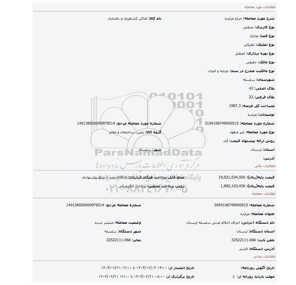 | شماره معامله: 3004106749000015 | شماره معامله مرجع: 140136920000979214 | |