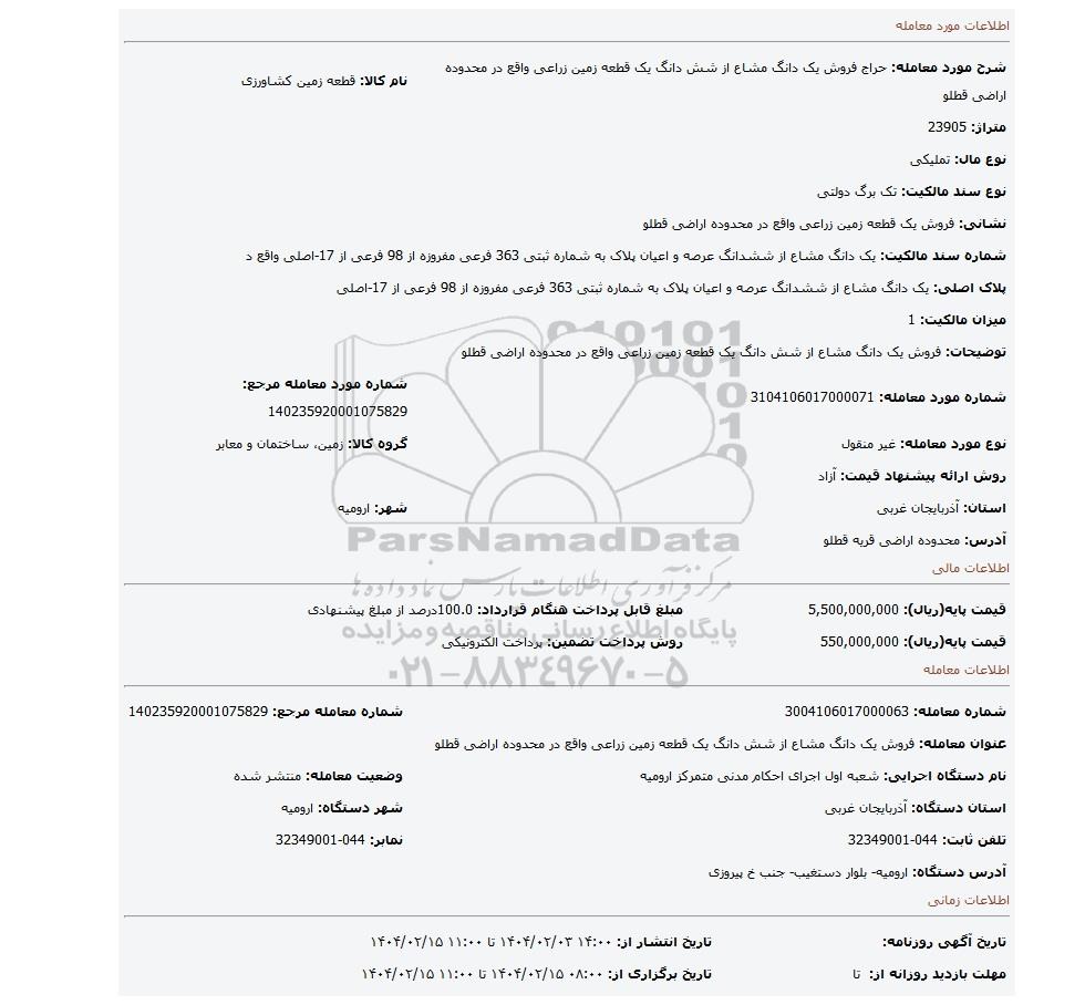 | شرح مورد معامله: حراج فروش یک دانگ مشاع از شش دانگ یک قطعه زمین زراعی واقع در محدوده اراضی قطلو | نام کالا: قطعه زمین کشاورزی | |