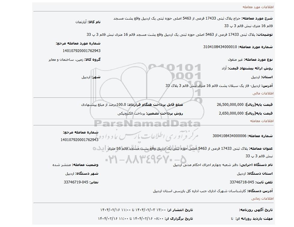مزایده پلاک ثبتی 17433 فرعی از 5463 اصلی حوزه ثبتی یک اردبیل واقع پشت مسجد قائم 16 متری نبش قائم 3 پ 33, مزایده، پلاک ثبتی 17433 فرعی از 5463 اصلی حوزه ثبتی یک اردبیل واقع پشت مسجد قائم 16 متری نبش قائم 3 پ 33