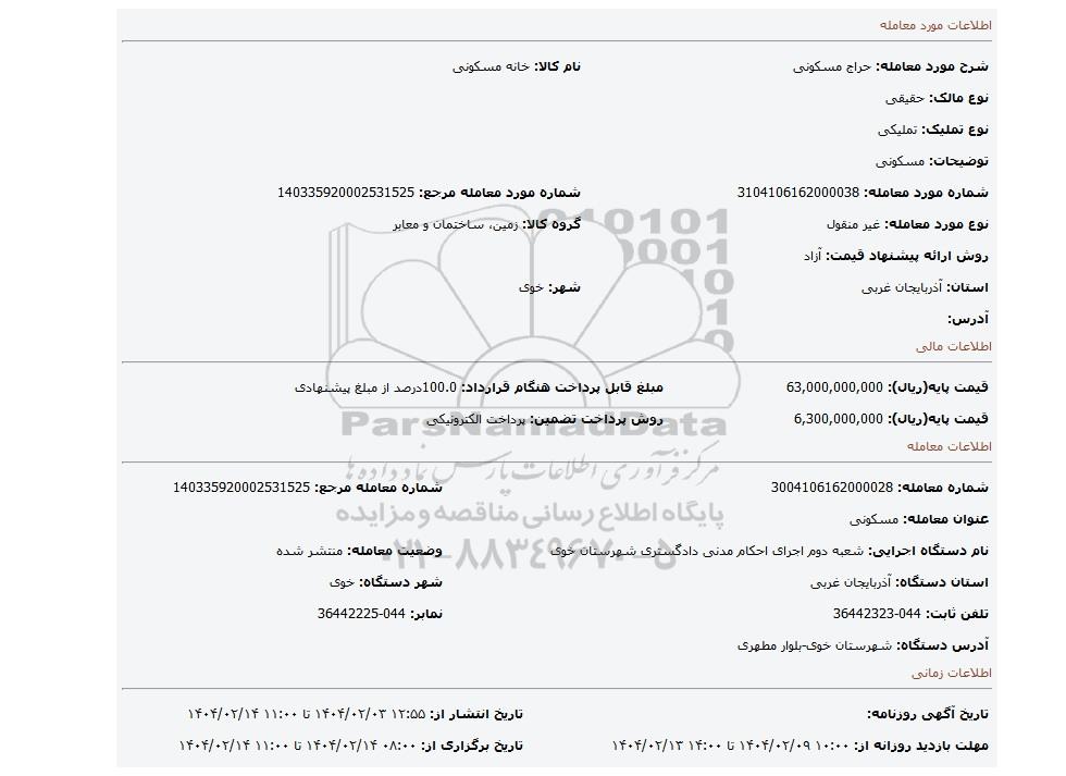 | نام دستگاه اجرایی: شعبه دوم اجرای احکام مدنی دادگستری شهرستان خوی | وضعیت معامله: منتشر شده | |
