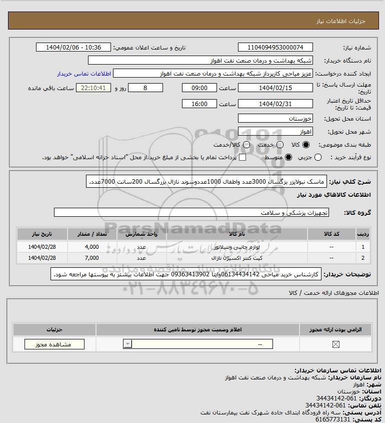 استعلام ماسک نبولایزر بزگسال 3000عدد واطفال 1000عددوسوند نازال بزرگسال 200سانت 7000عدد., استعلام ماسک نبولایزر بزگسال 3000عدد واطفال 1000عددوسوند نازال بزرگسال 200سانت 7000عدد.