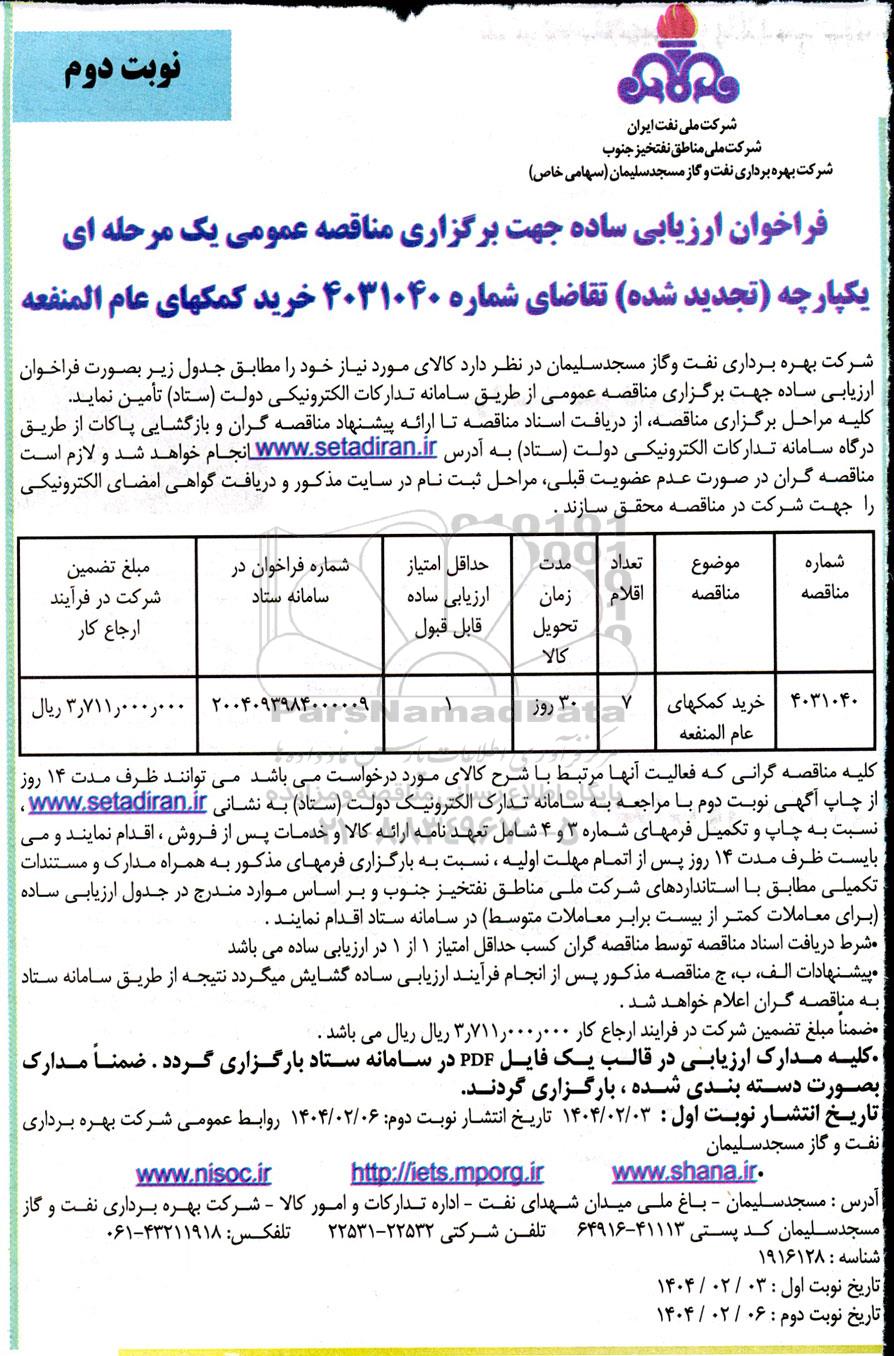 شرکت بهره برداری نفت و گاز مسجد سلیمان در نظر دارد کالای مورد نیاز خود را مطابق جدول زیر بصورت فراخوان ارزیابی کیفی جهت برگزاری مناقصه عمومی از طریق سامانه تدارکات الکترونیکی دولت (ستاد) تأمین نماید. کلیه مراحل برگزاری مناقصه از دریافت اسناد مناقصه تا ارائه پیشنهاد مناقصه گران و بازگشایی پاکات از طریق درگاه سامانه تدارکات الکترونیکی دولت (ستاد) به آدرس سایت ستاد انجام خواهد شد و لازم است مناقصه گران در صورت عدم عضویت قبلی مراحل ثبت نام در سایت مذکور و دریافت گواهی امضای الکترونیکی را جهت شرکت در مناقصه محقق سازند .