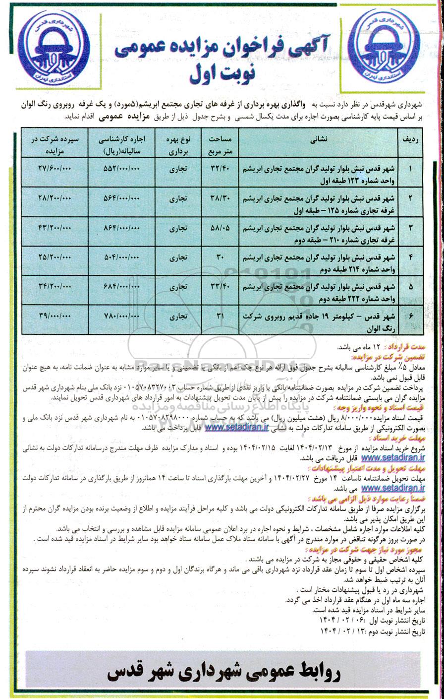 شهرداری شهر قدس در نظر دارد نسبت به واگذاری بهره برداری از غرفه های تجاری مجتمع ابریشم (5 مورد) و یک غرفه روبروی رنگ الوان بر اساس قیمت پایه کارشناسی بصورت اجاره برای مدت یکسال شمسی و بشرح جدول ذیل از طریق مزایده عمومی اقدام نماید.