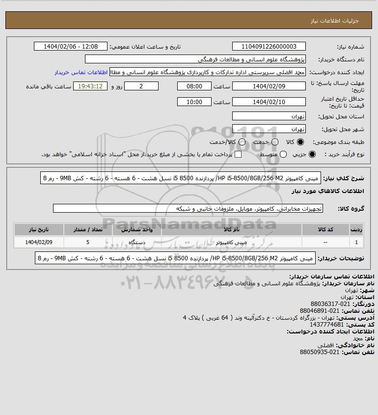 شرح کلی نیاز: مینی کامپیوتر HP i5-8500/8GB/256 M2/ پردازنده 8500 i5 نسل هشت - 6 هسته - 6 رشته - کش 9MB - رم 8