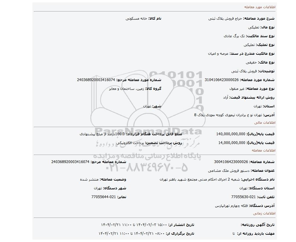 | قیمت پایه(ریال): 14,000,000,000 | روش پرداخت تضمین: پرداخت الکترونیکی |