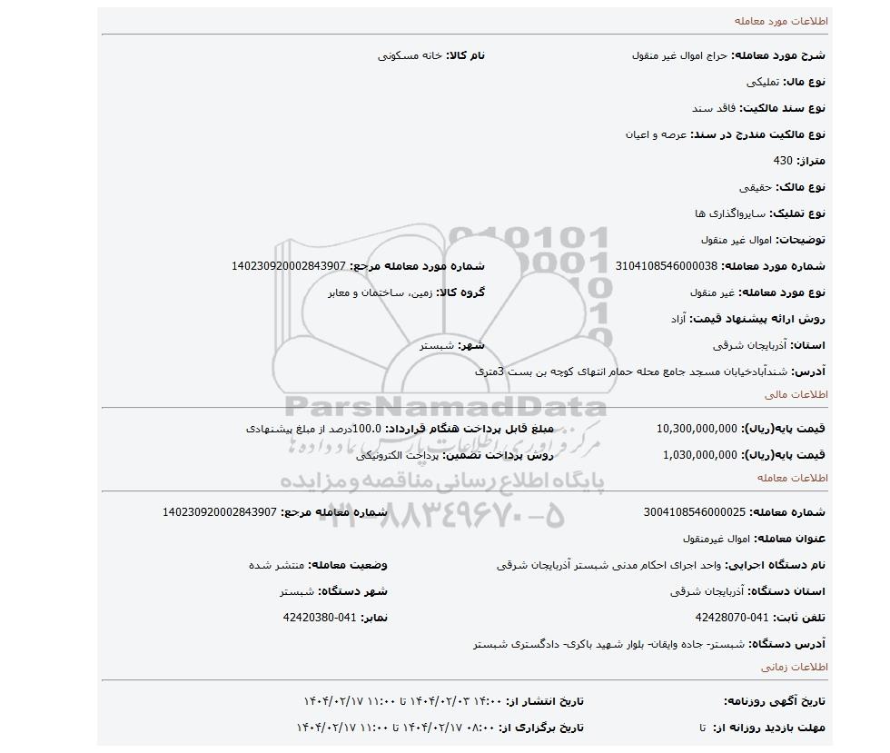 نام دستگاه اجرایی: واحد اجرای احکام مدنی شبستر آذربایجان شرقیوضعیت معامله: منتشر شده