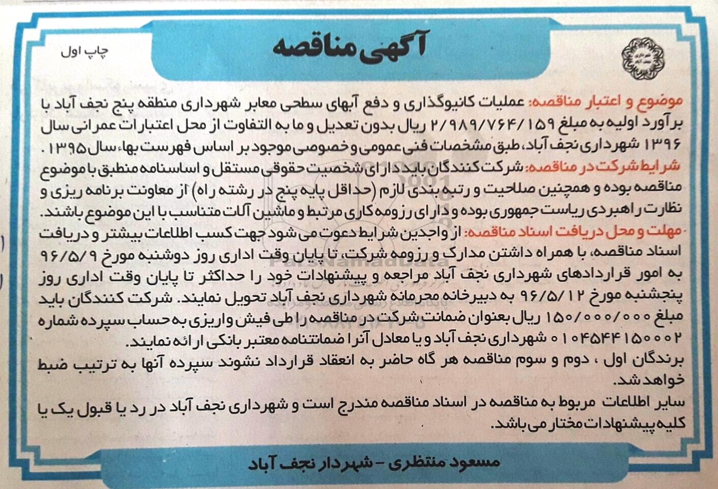 موضوع و اعتبار مناقصه: عملیات کانیوگذاری و دفع آبهای سطحی معابر شهرداری منطقه پنج نجف آباد بابرآورد اولیه به مبلغ 2.989.764.159 ریال بدون تعدیل و مابه التفاوت از محل اعتبارات عمرانی سال 1396 شهرداری نجف آباد طبق مشخصات فنی عمومی و خصوصی موجود بر اساس فهرست بهاء سال 1395