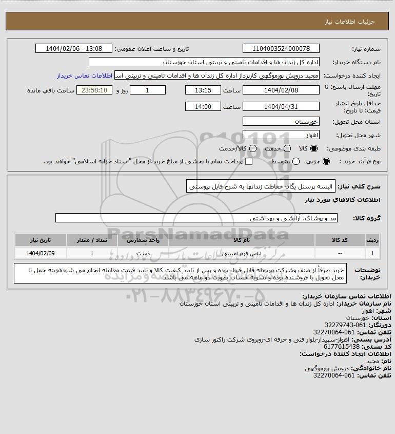 شرح کلی نیاز: البسه پرسنل یگان حفاظت زندانها به شرح فایل پیوستی