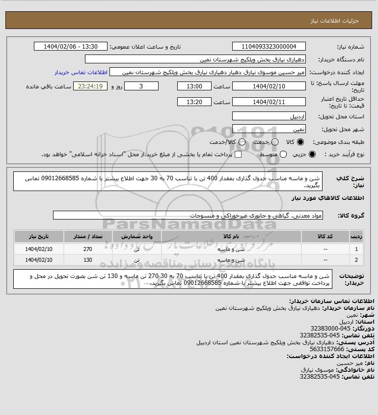 | 2 | -- | شن و ماسه | تن | 130 | 1404/02/10 |