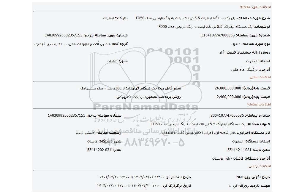 | عنوان معامله: یک دستگاه لیفتراک 5.5 تن تای لیفت به رنگ نارنجی مدل FD50 | ||