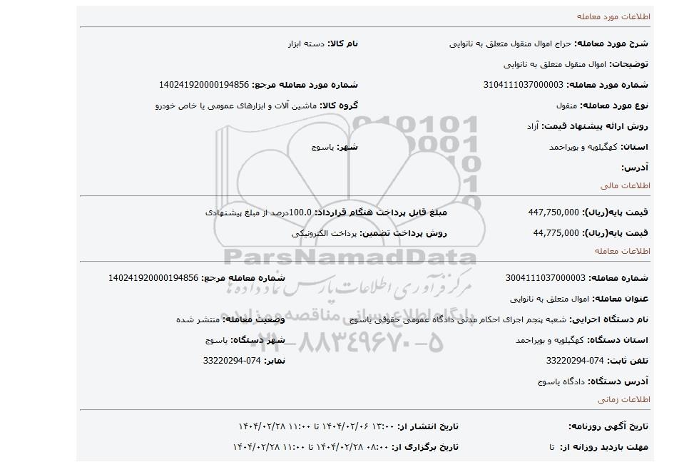 | شماره مورد معامله: 3104111037000003 | شماره مورد معامله مرجع: 140241920000194856 | |