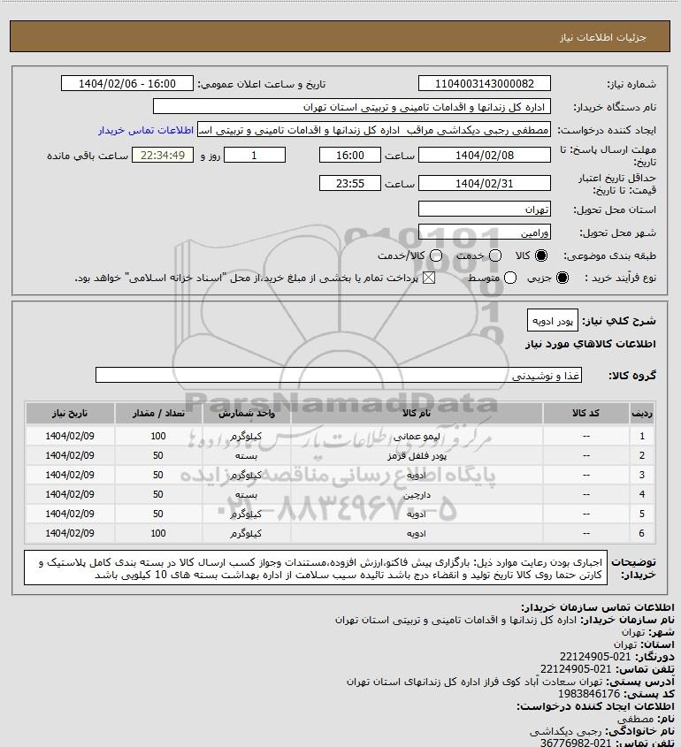 | 6 | -- | ادویه | کیلوگرم | 100 | 1404/02/09 |