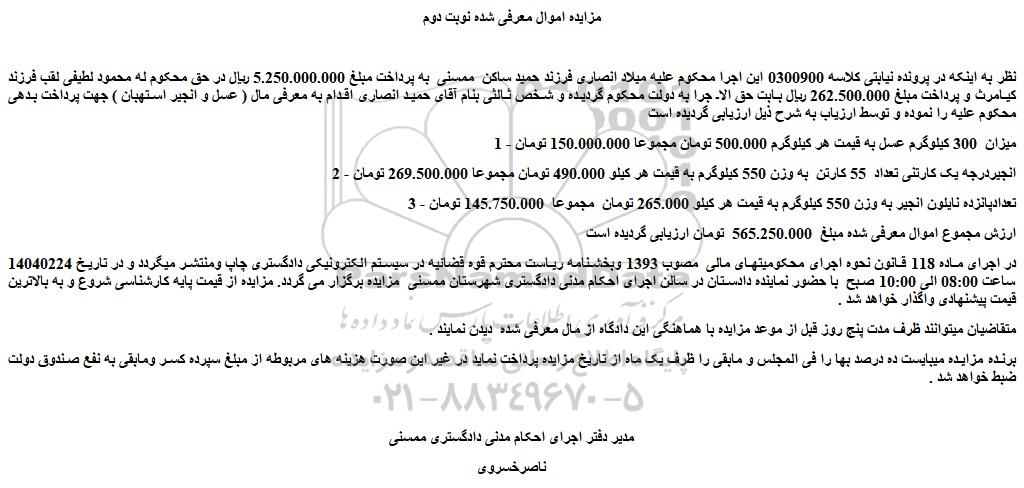 نظر به اینکه در پرونده نیابتی کلاسه 0300900 این اجرا محکوم علیه میلاد انصاری فرزند حمید ساکن ممسنی به پرداخت مبلغ 5.250.000.000 ریال در حق محکوم له محمود لطیفی لقب فرزند کیامرث و پرداخت مبلغ 262.500.000 ریال بابت حق الا جرا به دولت محکوم گردیده و شخص ثالثی بنام آقای حمید انصاری اقدام به معرفی مال ( عسل و انجیر استهبان ) جهت پرداخت بدهی محکوم علیه را نموده و توسط ارزیاب به شرح ذیل ارزیابی گردیده است