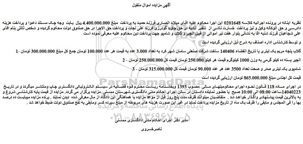 نظربه اینکه در پرونده اجرائیه کلاسه 0201648 این اجرا محکوم علیه اقای میلاد انصاری فرزند حمید به پرداخت مبلغ 4.400.000.000 ریال بابت وجه چک مستند دعوا و پرداخت هزینه دادرسی و حق الوکاله وکیل و نیز پرداخت خسارت ناشی از تاخیر تادیه در حق جاوید گودرزی فرزند علی نجات و پرداخت حق الاجرا در حق صندوق دولت محکوم گردیده و شخص ثالثی بنام اقای علی شجاعیان فرزند شنبه اقا به نشانی بلوار هفت تیر اموالی از قبیل انجیر و گلاب و شامپو جهت پرداخت دین محکوم علیه معرفی نموده است