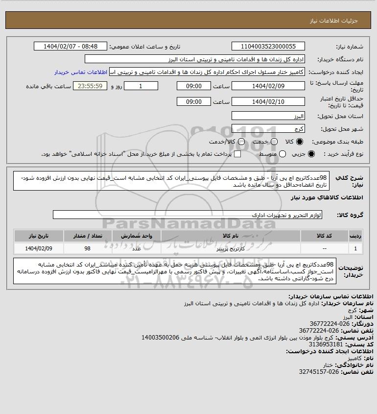 توضیحات خریدار:98عددکاتریچ اچ پی آریا -طبق ومشخصات فایل پیوستی هزینه حمل به عهده تأمین کننده میباشد_ایران کد انتخابی مشابه است_جواز کسب،اساسنامه،آگهی تغییرات، و پیش فاکتور رسمی با مهرالزامیست_قیمت نهایی فاکتور بدون ارزش افزوده درسامانه درج شود-گارانتی داشته باشد.