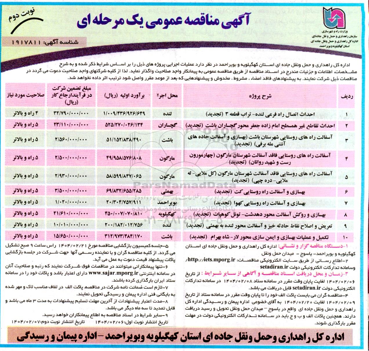 اداره کل راهداری و حمل و نقل جاده ای استان کهگیلویه و بویراحمد در نظر دارد عملیات اجرایی پروژه های ذیل را بر اساس شرایط ذکر شده و به شرح مشخصات اطلاعات و جزئیات مندرج در اسناد مناقصه از طریق مناقصه عمومی به پیمانکار واجد صلاحیت واگذار نماید لذا از کلیه شرکتهای واجد صلاحیت دعوت میگردد در مناقصات ذیل شرکت نمایند به پیشنهادهای فاقد امضاء ، مشروط ، مخدوش و پیشنهادهایی که بعد از موعد مقرر واصل شود ترتیب اثر داده نخواهد شد.