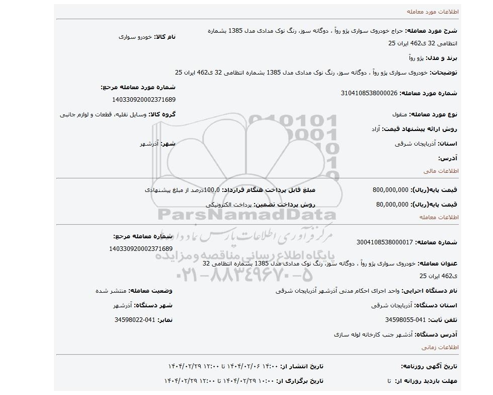 شرح مورد معامله: حراج خودروی سواری پژو روآ ، دوگانه سوز، رنگ نوک مدادی مدل 1385 بشماره انتظامی 32 ی462 ایران 25 نام کالا: خودرو سواری