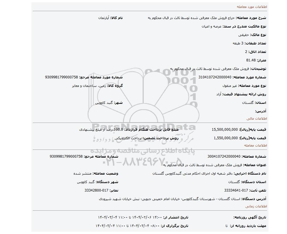 مزایده عمومی مزایده فروش ملک معرفی شده توسط ثالث در قبال محکوم به برگزار میگردد. از کلیه افراد متخصص و شرکتهای واجد شرایط دعوت به عمل میآید تا در این مزایده با کد خبرگزاری پارس نماد : 8933732 شرکت نمایند تاریخ شروع مزایده : 1404/02/06 مهلت شرکت در مزایده: تا پایان روز 1404/03/04 مکان برگزاری اموال واگذاری استانهای گلستان و دستهبندیهای مربوط به این حراجی املاک و زمین میباشد.