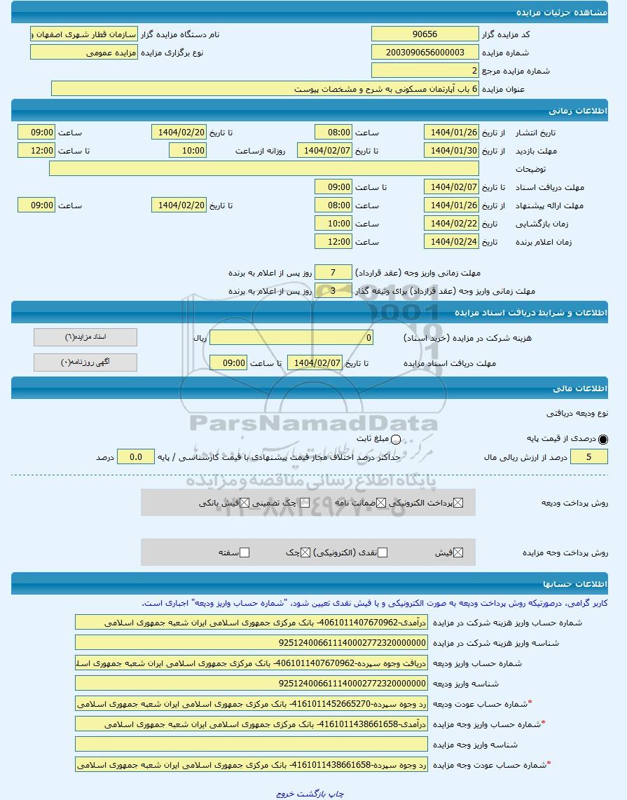 | عنوان مزایده | 6 باب آپارتمان مسکونی به شرح و مشخصات پیوست -مزایده آپارتمان - استان اصفهان | |||