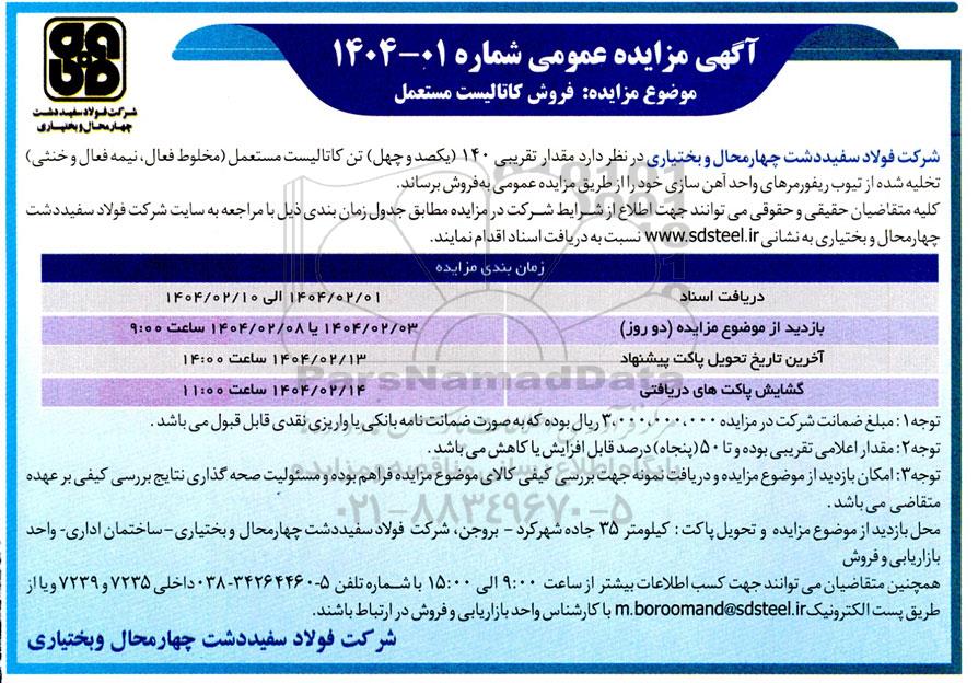 شرکت فولاد سفید دشت چهار محال و بختیاری در نظر دارد مقدار تقریبی 140 یکصد و چهل تن کاتالیست مستعمل مخلوط فعال، نیمه فعال و خنثی تخلیه شده از تیوب ریفورمرهای واحد آهن سازی خود را از طریق مزایده عمومی به فروش برساند. کلیه متقاضیان حقیقی و حقوقی می توانند جهت اطلاع از شرایط شرکت در مزایده مطابق جدول زمان بندی ذیل با مراجعه به سایت شرکت فولاد سفید دشت چهار محال و بختیاری به نشانی ستاد ایران نسبت به دریافت اسناد اقدام نمایند.