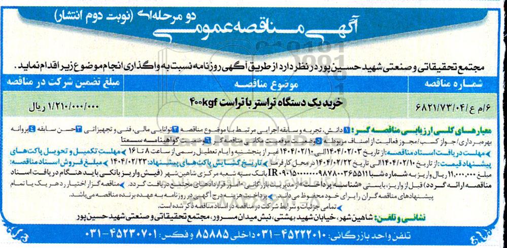 مجتمع تحقیقاتی و صنعتی شهید حسین پور در نظر دارد از طریق آگهی روزنامه نسبت به واگذاری انجام موضوع زیر اقدام نماید.
