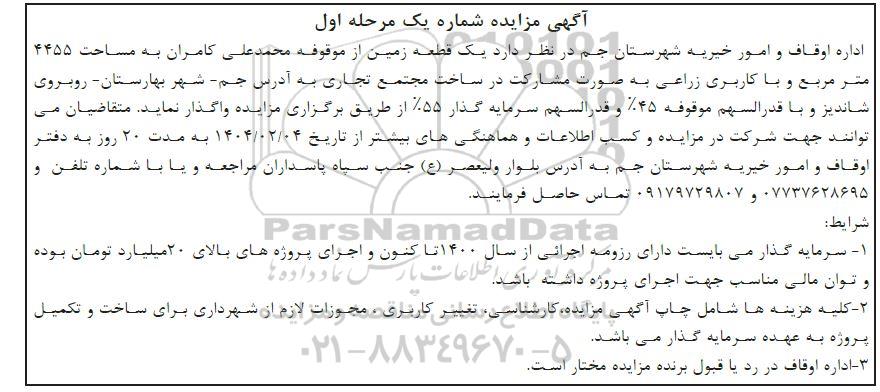 اداره اوقاف و امور خیریه شهرستان جم در نظر دارد یک قطعه زمین از موقوفه محمد علی کامران به مساحت 4455 متر مربع و با کاربری زراعی به صورت مشارکت در ساخت مجتمع تجاری به آدرس -جم - شهر بهارستان - روبروی شاندیز و با قدر السهم موقوفه 45% و قدر السهم سرمایه گذار 55 % از طریق برگزاری مزایده واگذار نماید. متقاضیان می توانند جهت شرکت در مزایده و کسب اطلاعات و هماهنگیهای بیشتر از تاریخ 1404.02.04 به مدت 20 روز به دفتر اوقاف و امور خیریه شهرستان جم به آدرس بلوار ولیعصر (ع) جنب سپاه پاسداران مراجعه و یا با شماره تلفن و 7737628695 و 09179729807 تماس حاصل فرمایند.