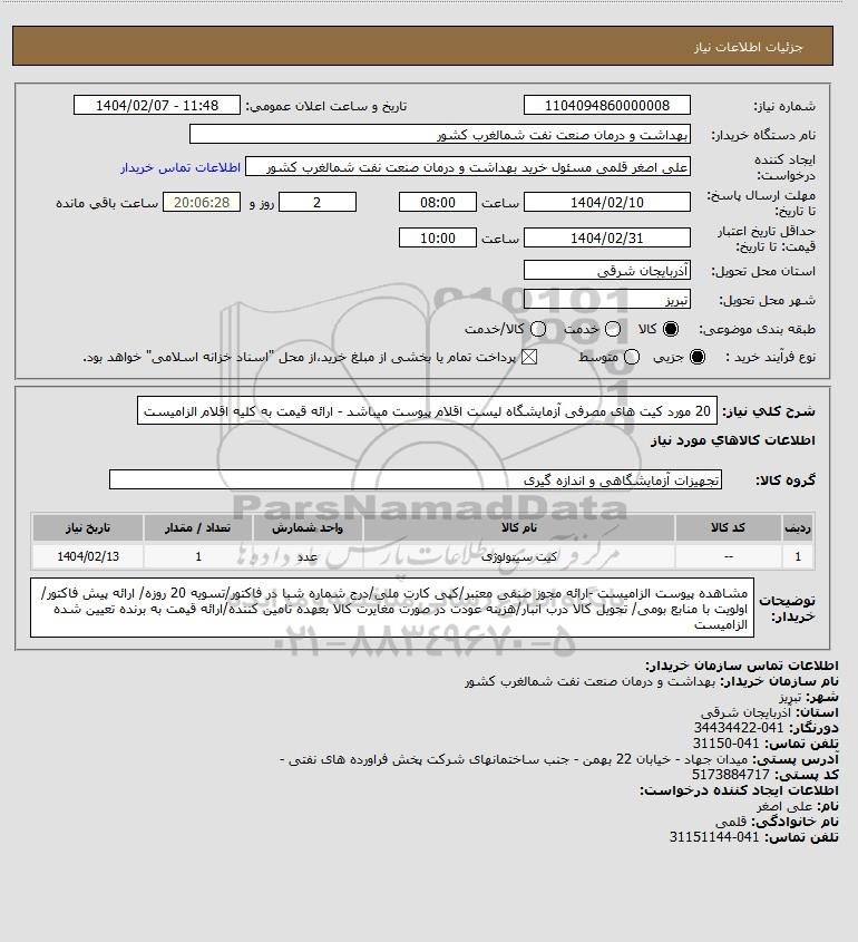 نام دستگاه خریدار:بهداشت و درمان صنعت نفت شمالغرب کشور