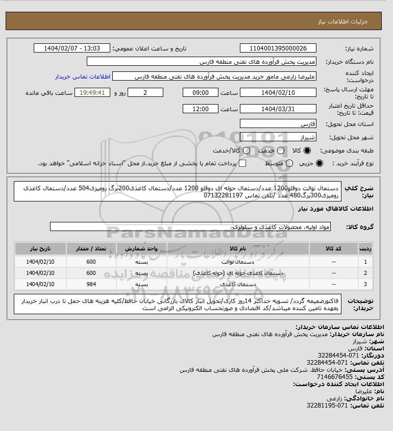 شرح کلی نیاز: دستمال توالت دوقلو1200 عدد/دستمال حوله ای دوقلو 1200 عدد/دستمال کاغذی200برگ رومیزی504 عدد/دستمال کاغذی رومیزی300برگ480 عدد /تلفن تماس 07132281197