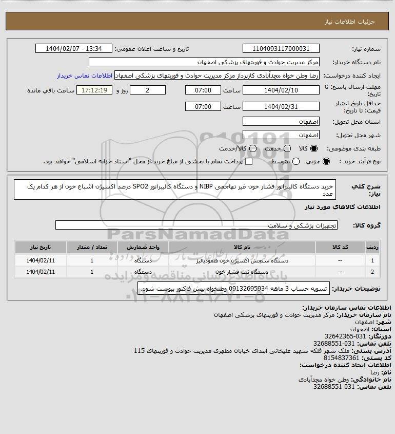 نام دستگاه خریدار:مرکز مدیریت حوادث و فوریتهای پزشکی اصفهان