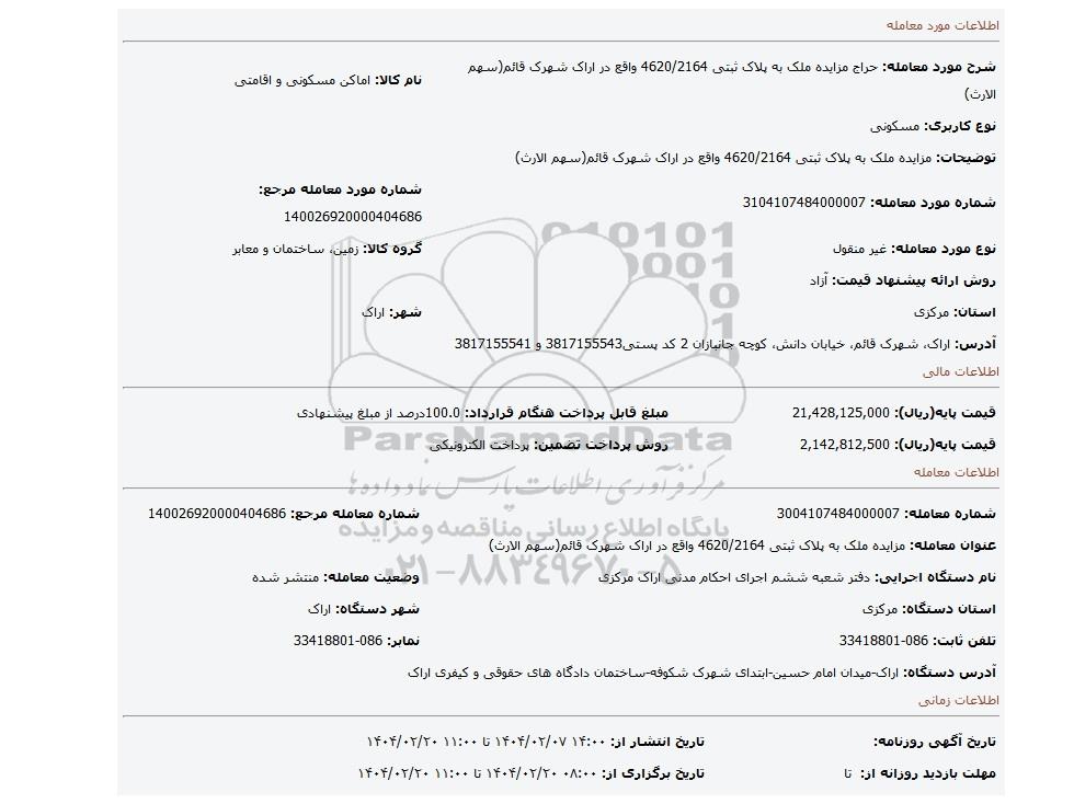 عنوان معامله: مزایده ملک به پلاک ثبتی 4620/2164 واقع در اراک شهرک قائم(سهم الارث)