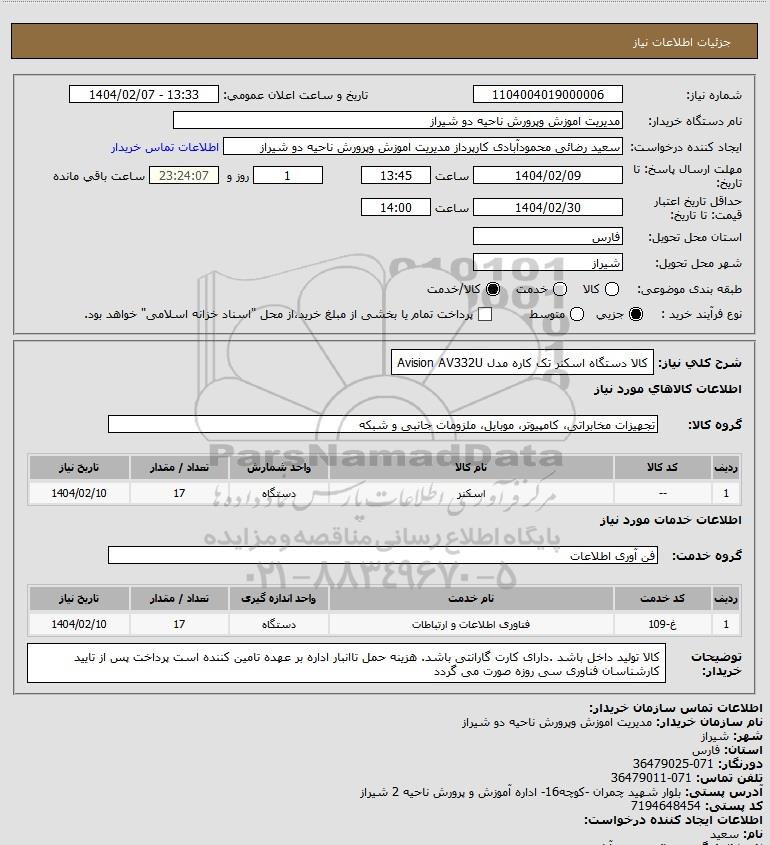 نام دستگاه خریدار:مدیریت اموزش وپرورش ناحیه دو شیراز