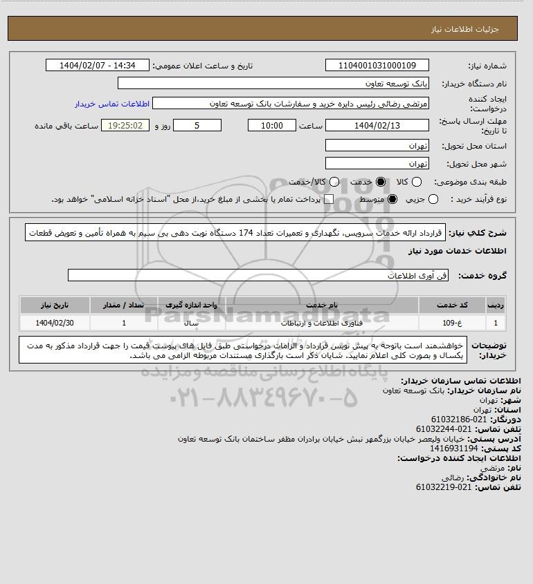 شرح کلی نیاز: قرارداد ارائه خدمات سرویس، نگهداری و تعمیرات تعداد 174 دستگاه نوبت دهی بی سیم به همراه تأمین و تعویض قطعات