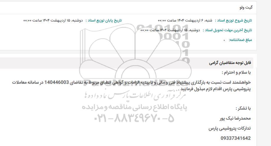خواهشمند است نسبت به بارگذاری پیشنهاد فنی و مالی و تاییدیه الزامات و گواهی انطباق مربوط به تقاضای 140446003 در سامانه معاملات پتروشیمی پارس اقدام لازم مبذول فرمایید .
