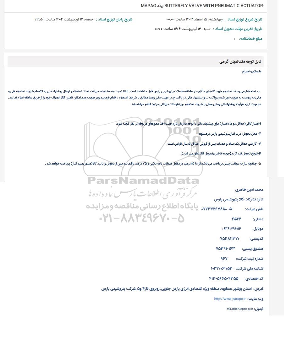 به استحضار می رساند استعلام خرید تقاضای مذکور در سامانه معاملات پتروشیمی پارس قابل مشاهده است. لطفا نسبت به مشاهده دریافت استاد استعلام و ارسال پیشنهاد فنی به انضمام شرایط استعلام فنی و مالی به پیوست به صورت مهر شده در پاکت ب و پیشنهاد مالی در پاکت ج در مهلت مقرر وعينا مطابق با شرایط استعلام ، اقدام فرمایید و در صورت عدم امکان تامین کالا انصراف خود را از طریق سامانه اعلام نمایید. در صورت ارایه هرگونه پیشنها دفتی و مالی مغایر با شرایط استعلام ، پیشنهادات دریافتی مردود اعلام خواهد شد.