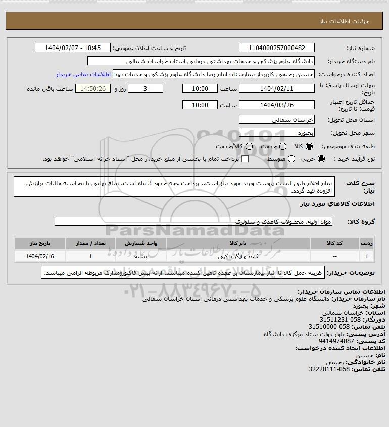 نام دستگاه خریدار:دانشگاه علوم پزشکی و خدمات بهداشتی درمانی استان خراسان شمالی