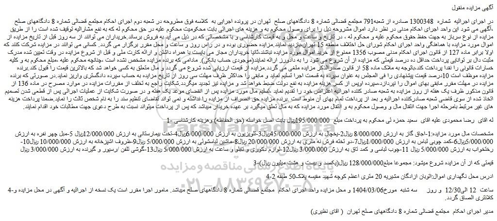 در اجرای اجرائیه شماره 1300348 صادره از شعبه791 مجتمع قضائی شماره 8 دادگاههای صلح تهران در پرونده اجرایی به کلاسه فوق مطروحه در شعبه دوم اجرای احکام مجتمع قضائی شماره 8 دادگاههای صلح ،آگهی می شود این واحد اجرای احکام مدنی در نظر دارد اموال مشروحه ذیل را برای وصول محکوم به و هزینه های اجرائی بابت محکومیت محکوم علیه در حق محکوم له که به نفع مشارالیه توقیف شده است را از طریق مزایده از نوع سرباز به جهت حفظ حقوق محکوم علیه و محکوم له ، در تاریخ و ساعت و محل و به قیمت کارشناسی و با مشخصاتی که در ذیل می آید به فروش برساند.خریداران می توانند از سه روز قبل از تاریخ مزایده از اموال مورد مزایده با هماهنگی واحد اجرای احکام شورای حل اختلاف منطقه 15 تهران،بازدید نمایند.مزایده حضوری بوده و در راس روز و ساعت و محل مقرر برگزار می گردد. کسانی می توانند در مزایده شرکت کنند که اولا برابر ماده 127 از قانون اجرای احکام مدنی مصوب 1356 ممنوع از خرید اموال مورد مزایده نباشند،ثانیا خریداران مجاز می بایست با همراه داشتن و ارائه کارت ملی و قبل از شروع مزایده در وقت تعیین شده مدرک مثبت دال بر توانایی پرداخت حداقل ده درصد قیمتی که مزایده از آن شروع می شود را به دادورز ارائه نمایند(موجودی حساب بانکی). مادامی که برنده مزایده مشخص نشده است ،چنانچه محکوم علیه ،مبلغ محکوم به و کلیه خسارات قانونی را نقدا پرداخت کند،باتوجه به ملاک ماده 58 از قانون صدرالذکر مزایده ملغی می گردد.مزایده از قیمت ارزیابی شده شروع می گردد و مال متعلق به کسی خواهد شد که بالاترین قیمت را قبول کند.برنده مزایده موظف است 10درصد قیمت پیشنهادی را فی المجلس به عنوان سپرده به قسمت اجرا تسلیم نماید و مابقی را حداکثر ظرف مهلت سی روز از تاریخ مزایده به حساب سپرده دادگستری واریز نماید.در صورتی که برنده مزایده در مهلت مقرر مابقی بهای اموال را نپردازد،سپرده اوپس از کسر هزینه مزایده به نفع دولت ضبط خواهد شد و مزایده نیز تجدید میگردد.شکایت راجع به تخلف از مقررات مزایده در موارد مصرح در ماده 136 از قانون مذکور ظرف یک هفته از روز مزایده به شعبه صادر کننده اجرائیه اعتراض خود را تقدیم نماید ،تسلیم مال مورد مزایده پس از انقضای موعد یک هفته و در صورت شکایت از عملیات اجرائی پس از قطعی شدن تصمیم اتخاذ شده از سوی قاضی شعبه صادرکننده اجرائیه و بعد از پرداخت تمام بهای آن منوط است .برنده مزایده حق انصراف از مزایده را نداشته و نمی تواند تقاضای تنظیم سند را به نام شخص ثالث را نماید.ضمنا پرداخت هزینه های غیر مرتبط بامرحله اجرا جهت انتقال مال و وصول محکوم به و انتقال مورد مزایده که به مال تعلق میگیرد بر عهده خریدار میباشد که پس از پرداخت میتواند نسبت به طرح دعوی جهت مطالبات خود اقدام نمایند.