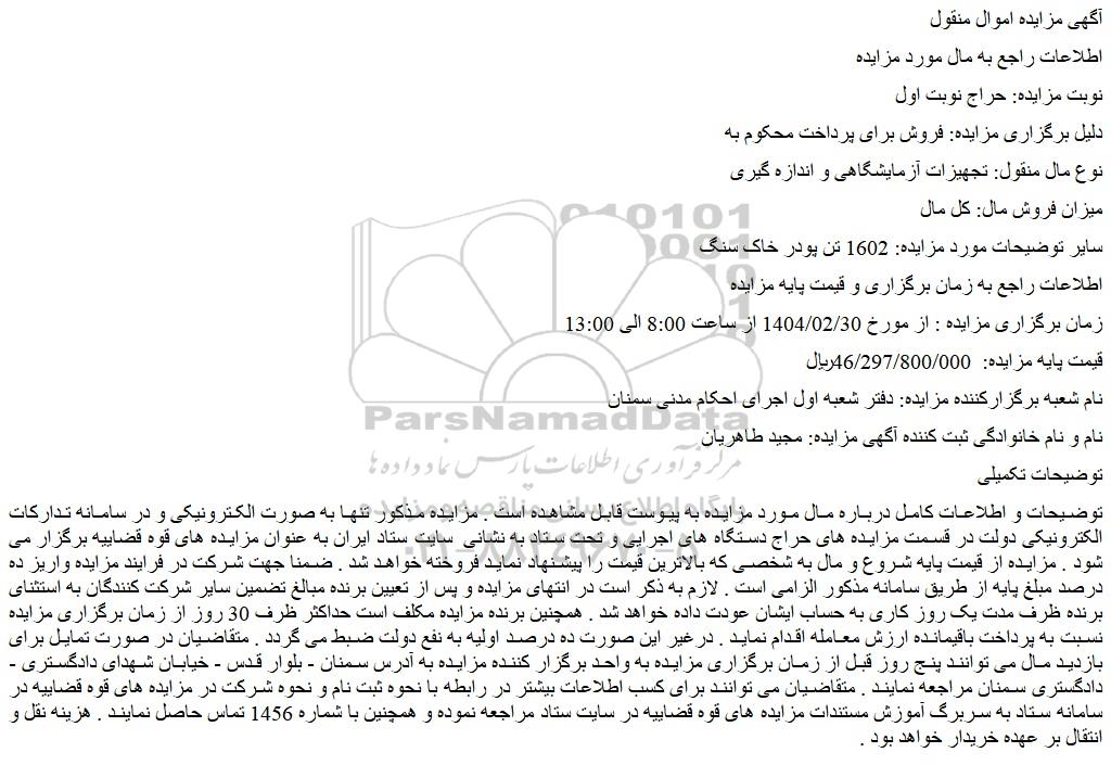 توضیحات و اطلاعات کامل درباره مال مورد مزایده به پیوست قابل مشاهده است . مزایده مذکور تنها به صورت الکترونیکی و در سامانه تدارکات الکترونیکی دولت در قسمت مزایده های حراج دستگاه های اجرایی و تحت ستاد به نشانی سایت ستاد ایران به عنوان مزایده های قوه قضاییه برگزار می شود . مزایده از قیمت پایه شروع و مال به شخصی که بالاترین قیمت را پیشنهاد نماید فروخته خواهد شد . ضمنا جهت شرکت در فرایند مزایده واریز ده درصد مبلغ پایه از طریق سامانه مذکور الزامی است . لازم به ذکر است در انتهای مزایده و پس از تعیین برنده مبالغ تضمین سایر شرکت کنندگان به استثنای برنده ظرف مدت یک روز کاری به حساب ایشان عودت داده خواهد شد . همچنین برنده مزایده مکلف است حداکثر ظرف 30 روز از زمان برگزاری مزایده نسبت به پرداخت باقیمانده ارزش معامله اقدام نماید . درغیر این صورت ده درصد اولیه به نفع دولت ضبط می گردد . متقاضیان در صورت تمایل برای بازدید مال می توانند پنج روز قبل از زمان برگزاری مزایده به واحد برگزار کننده مزایده به آدرس سمنان - بلوار قدس - خیابان شهدای دادگستری - دادگستری سمنان مراجعه نمایند . متقاضیان می توانند برای کسب اطلاعات بیشتر در رابطه با نحوه ثبت نام و نحوه شرکت در مزایده های قوه قضاییه در سامانه ستاد به سربرگ آموزش مستندات مزایده های قوه قضاییه در سایت ستاد مراجعه نموده و همچنین با شماره 1456 تماس حاصل نمایند . هزینه نقل و انتقال بر عهده خریدار خواهد بود .