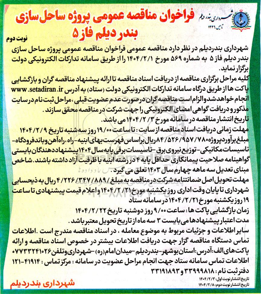 شهرداری بندر دیلم در نظر دارد مناقصه عمومی فراخوان مناقصه عمومی پروژه ساحل سازی بندر دیلم فاز 5 به شماره 569 مورخ 1404.2.1 را از طریق سامانه تدارکات الکترونیکی دولت برگزار نماید
